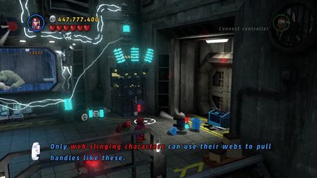 上のフロアで、左側へ進む。Mr.ファンタスティックの通れる格子があるの通り抜け、スパイダーマンになる。スパイダーセンスを使い、フックを引っ張るとスタン・リーが出てくる。